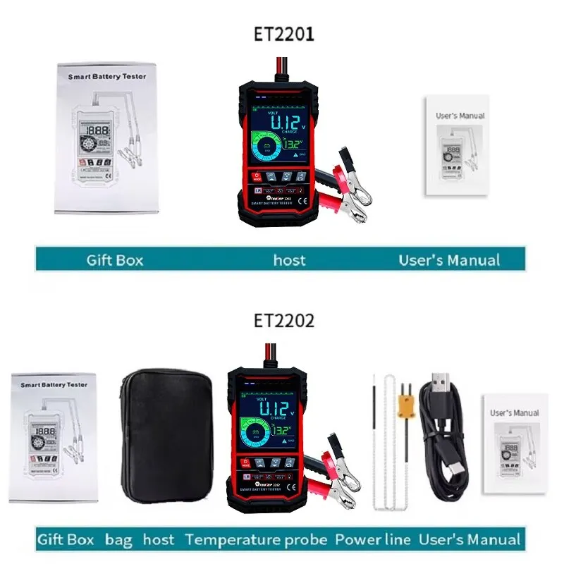 Et2202:Temperatur test, Lade kapazitäts testBatterie test (Batteries pannung, Innen widerstand, Entladung strom), Start-Test (Entladung leistung) und Belastungs test (Generator leistung)